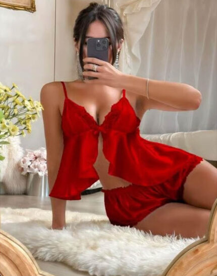 Kırmızı Saten Şortlu Takım
