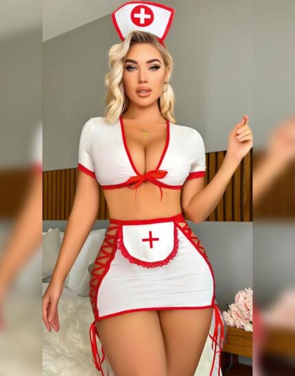 Beyaz Kenarları Kırmızı Detaylı Hemşire Kostüm