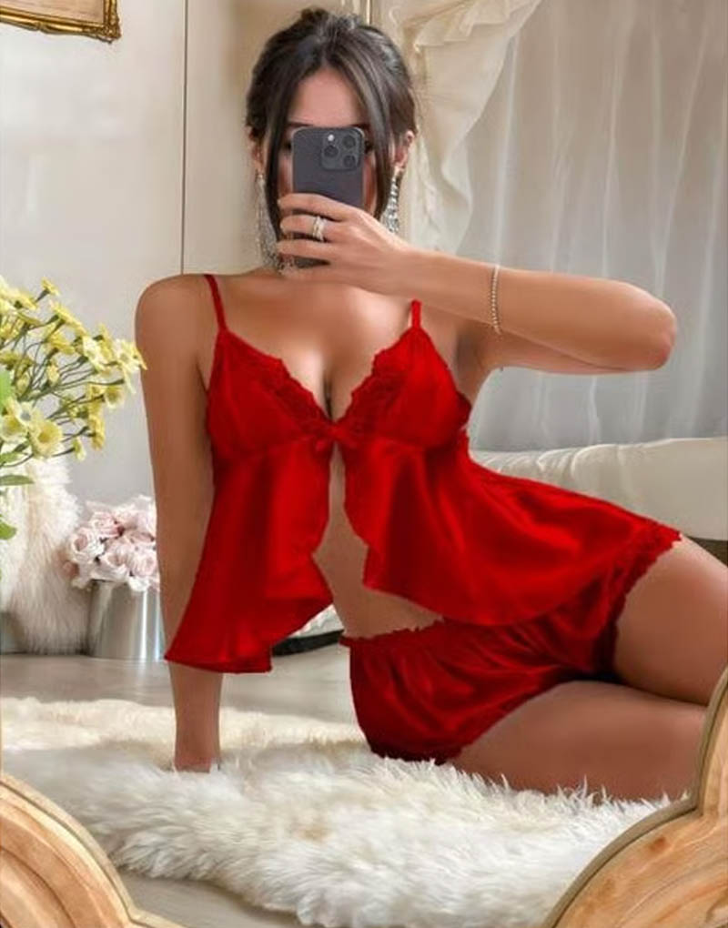 Kırmızı Fırfır Detaylı Dantelli Fantazi Sütyen ve Mini Etek